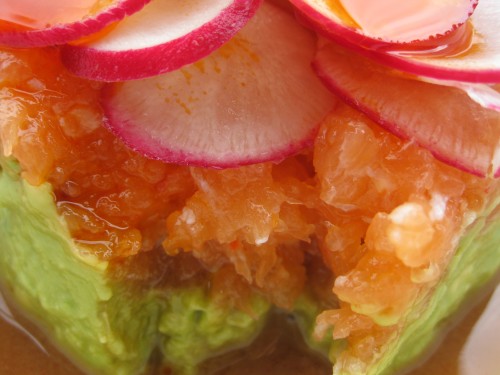 (salmon and avocado tartare + lemon&jasmine lemonade + chocolate and banana kulfi = yummy!)