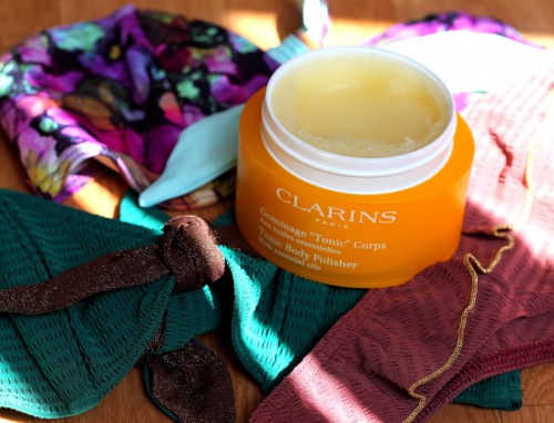 - Complètement addict aux produits Clarins*, en ce moment j’use et j’abuse du divin Gommage 'Tonic' Corps (pure gourmandise olfactive, dans la même lignée que les huiles de la marque. J'adore son efficacité fraîche et dynamisante. Après un cours de yoga je ne vous raconte pas le bonheur!), puis le matin du Lait Hydratant Corps Soyeux (sa texture pénètre rapidement et permet de s'habiller sitôt appliqué. J'apprécie particulièrement son odeur discrète) et de l’Huile Corps Irisée après la piscine, surtout si j'ai prévu de sortir le soir. Elle est parfaite pour illuminer la peau, la nourrir et parfumer. Un vrai doudou aux beaux jours). Ma peau, régulièrement malmenée à cause des km passés dans le chlore, aime et se languit de recevoir les premiers réconfortants rayons de soleil de la saison. Mummmmmmmmmm !