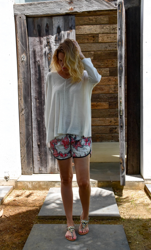 Short Garcia Jeans (new co), pull And Less (new co), nu-pieds Vanessa Bruno X K. Jacques shoppés à La Vallée Village (old).