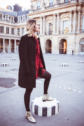 Robe Rinascimento (collection actuelle) | Manteau Chemins Blancs (hiver 2018, déjà vu ICI) | Boots Susanna Chloé shoppées à La Vallée Village | Blond par Elodie pour Zazen Paris | Rouge à Lèvres 'Joli Rouge Velvet 742' Clarins | Photos Myriem Himmich.