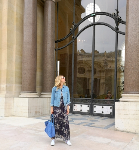 Robe Coachella Bande de Biches, lunettes Jimmy Fairly, sac Goyard, Rouge à Lèvres 'Joli Rouge Velvet 742' Clarins , baskets Céline shoppées à La Vallée Village, veste en jean Fam Jeans.