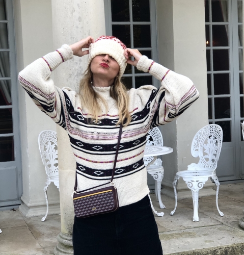 Cardigan et bonnet Isabel Marant, jupe Camaieu, boots Père & Fils